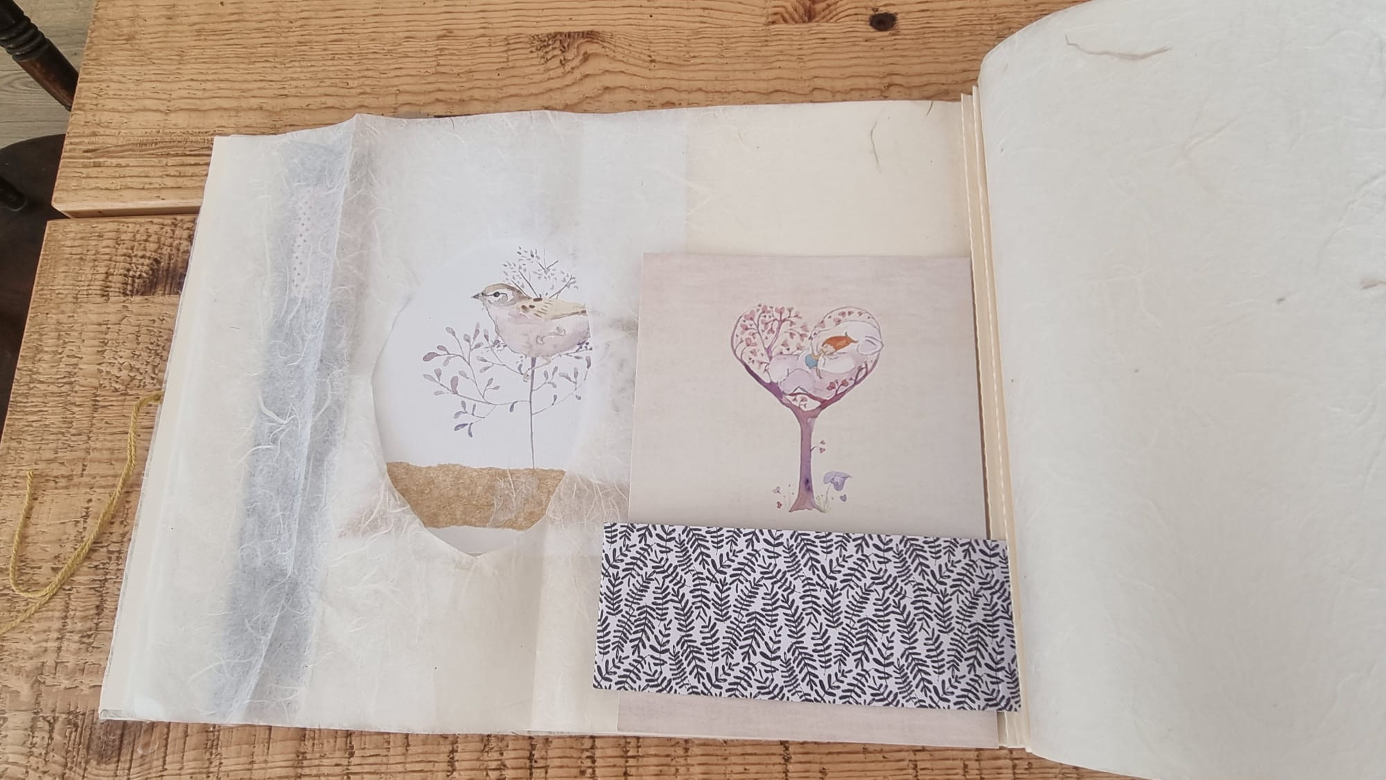 בפנים האלבום, דפי טקסטורה, כיסים עם אוצרות, איורי ציפורים ודפי השראה,