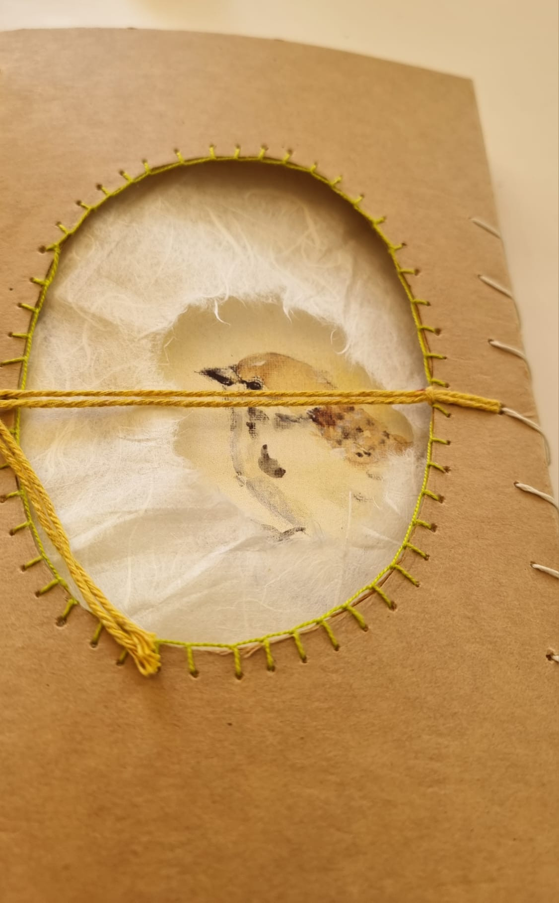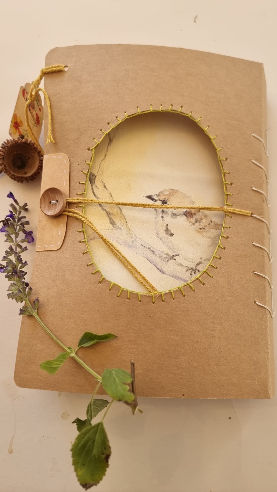 על כריכת המחברת איור ציפור דרור בתוספת רקמה.