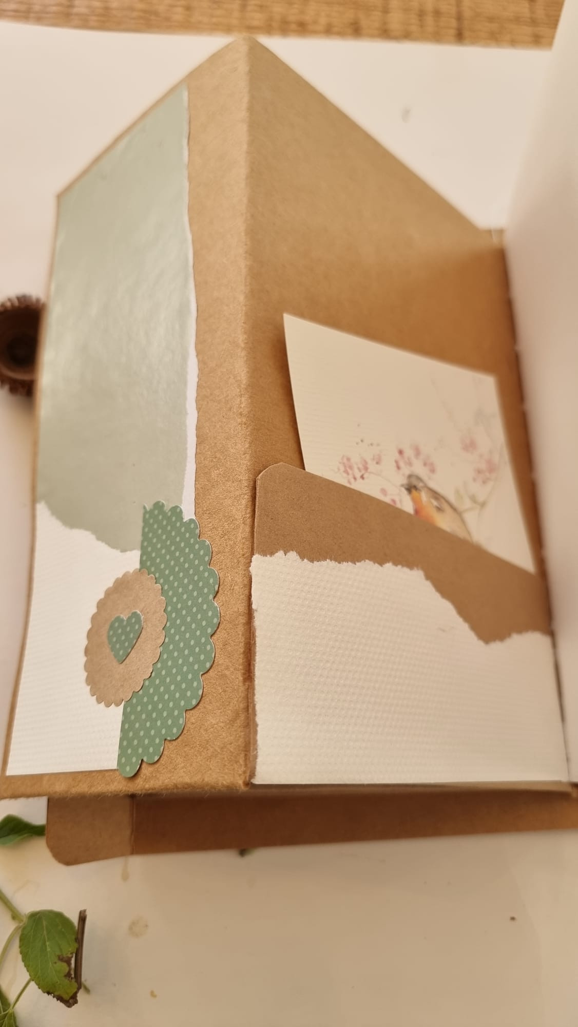 בפנים המחברת , כיסים עם אוצרות, איורי ציפורים ודפי השראה,