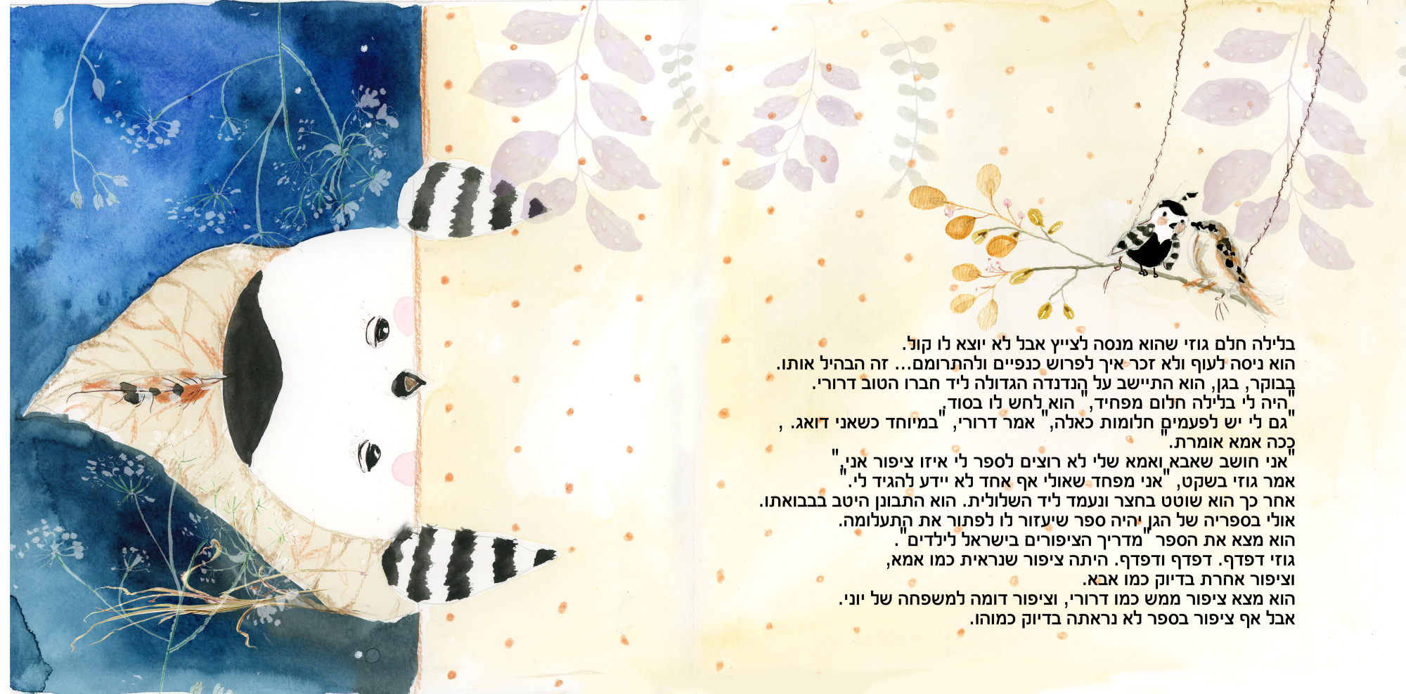 כש מיכל כהן פנתה אלי לאייר עבורה את הספר, היא שיתפה אותי שהיא מתלבטת. בלב היא מרגישה שזה ממש נכון, אבל הוסבר לה שאיורים לספרי ילדים 'צריכים' להיות חמודים וצבעוניים כי 'זה מה שילדים אוהבים'.מיכל כתבה ספר על ציפורים, על אהבת טבע, ובעצם על אהבה בין בני אדם שמגיעים ממקומות ומרקעים שונים ועל החיבור ביניהם. היא כתבה אותו בעדינות , רגישות ואהבה לסביבה. כשהיא הגיעה אלי לפגישה ראשונית, לבית שלי המוקף עצי אורן גבוהים, גינת בר פרועה ומיני ציפורים מצייצות, שתינו הרגשנו שזה ממש בסדר להרחיב את הקביעה 'למה שילדים אוהבים' ולאפשר להם להחשף ולחוות עוד רבדים ועומק של יצירה. ובכלל, אני מאמינה שיש חשיבות אמיתית לפנות אל הילד כאל יצור בוגר ונבון ולאפשר לו חשיפה למגוון של סגנונות, פרשנויות ורבדים. אין צורך בעיני לתת מענה ראשוני לעוס, מלוטש וממוחשב שיהיה קל ומיידי לעיכול. זו דרך וגישה שמובילה אותי ביצירה שלי ועם השנים אני מרגישה יותר ויותר נאמנה ובטוחה בדרך הזו, לשפה שהיא שלי ופחות לצורך לרצות על פי תבניות מוסכמות של נכון ולא נכון.איור של ספר הוא יציאה למסע משותף, חשיבה, הקשבה וגילוי הדרך. מופלאה בעיני ההזדמנות לדפדף בין דפי ספר, לצלול לתוכו, לגלות בו עומקים ולהתייחס אליו כאל סוג של יצירה ששלובים בה מלים ומכחול.עם כל סיפור כזה שמונח על שולחן העבודה שלי, אני מברכת ומתרגשת מהזכות הזו, על הכותבים והוצאות הספרים שנותנות בי אמון, על הילדים ששמחים ומעמיקים בספר. על הזכות להעז ולהאמין בקול שלי ולהשמיע אותו. אני מרגישה שהאיורים זורמים מהלב שלי, מגישושי החיפוש עם העפרון, מכתמי צבעי המים. אני מוצאת את עצמי מחייכת ומתרגשת לפעמים מרעיון חדש, מכתם צבע, מעולם שנברא על דף לבן.