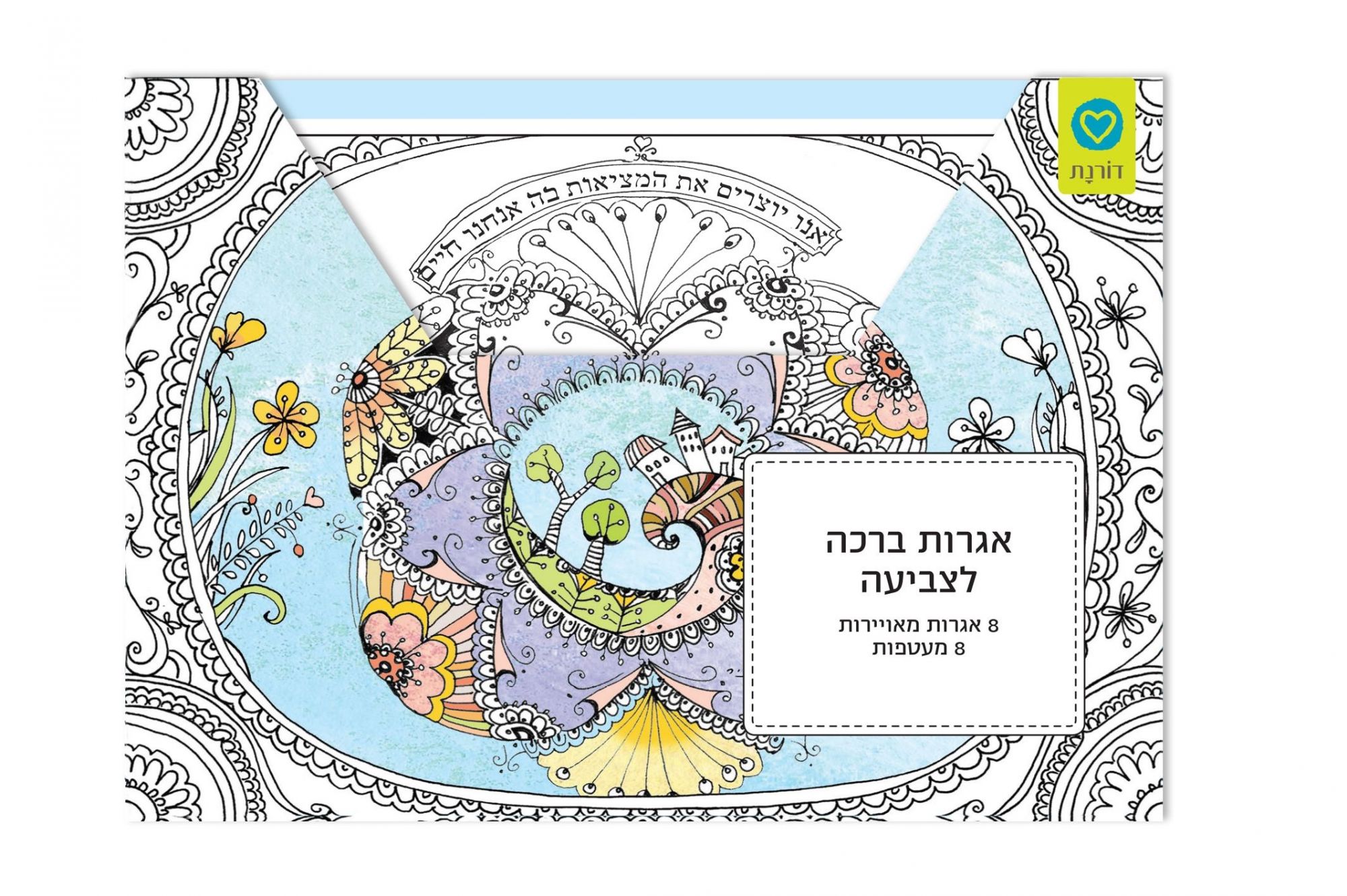 הסט כולל 8 כרטיסי ברכה באיורי מנדלות ופרחים בצבע שחור לבן, המיועדים לצביעה.