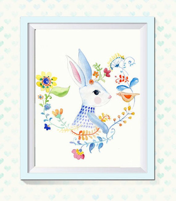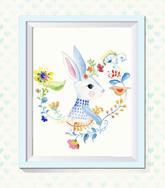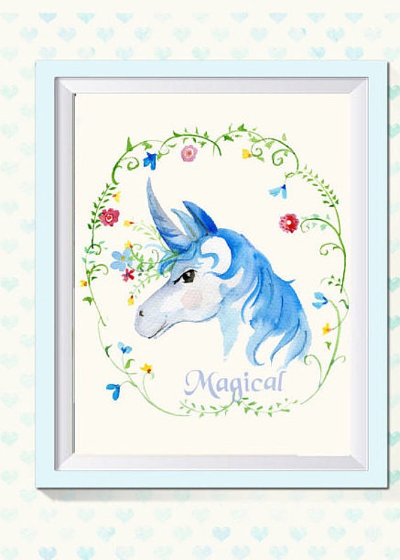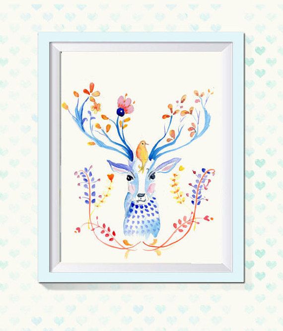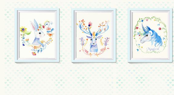 סט של 3 איורים קסומים במיוחד, בצבעי מים ובהם ארנבת, חד קרן ואייל בתוספת איור פרחים עדין.